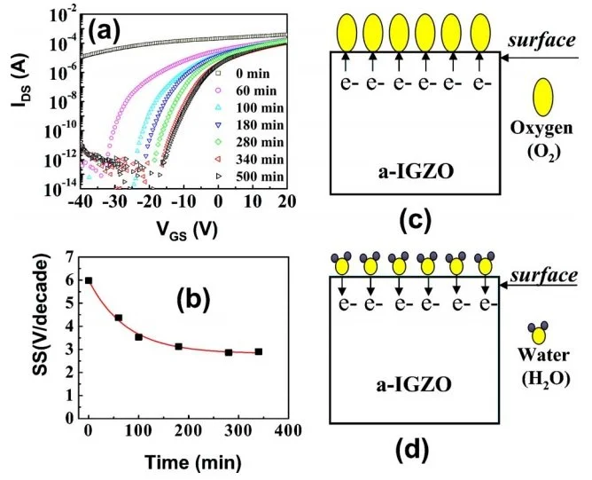 "Electronic transport properties of amorphous indium-gallium-zinc-oxide semiconductor upon exposure to water”